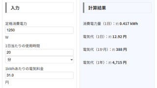 電気代チェッカー(消費電力から計算) 定格電力と1日の使用時間、電気料金を入力すると、 1日・1か月・1年の電気代目安が分かります。 よく使われる家電 ドライヤー(1200W) 電子レンジ(800W) エアコン(1000W) 電気ケトル(1...