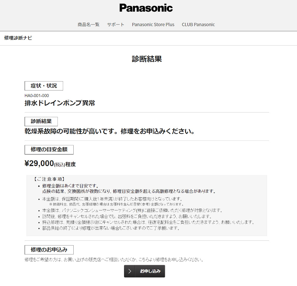 パナソニックサイト「修理診断ナビ」の診断結果